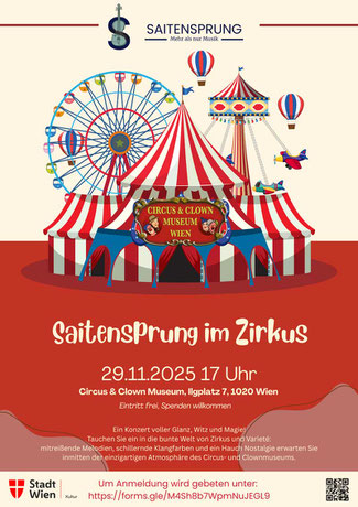 Unter dem Motto "Saitensprung im Zirkus" lädt Saitensprung zu einem besonderen musikalischen Erlebnis ein. Inmitten der bunten Welt des Circus- und Clownmuseums erklingen Melodien, die das Publikum auf eine Reise durch zwei Jahrhunderte Zirkus- und Varietémusik mitnehmen.